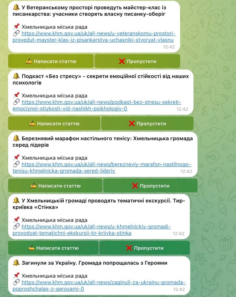 Відібрані новини надходять для погодження у Telegram-бот менеджера. Тепер з’являється можливість погодити новину для подальшої підготовки та публікації чи пропустити пропозицію. Ось як це виглядає: