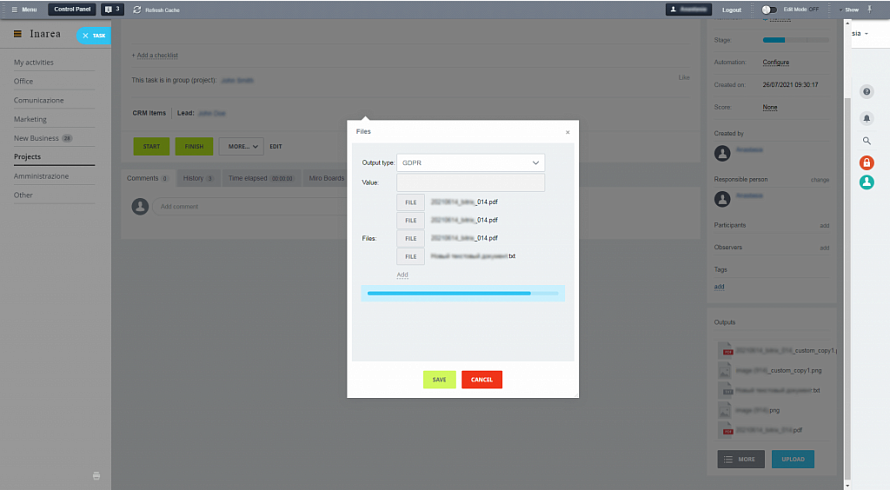 Наші розробники кастомізували компонент tasks.tasks.detail.part і доповнили інтерфейс Завдання новим вікном, що дозволяє завантажувати додаткові файли. Вони зберігаються безпосередньо в завданнях, а також на диску робочої групи того чи іншого проекту. Так як замовник працює з величезною кількістю клієнтів і постачальників, ми передбачили можливість зберігати в рамках проектів додаткові робочі документи. Також для зручності клієнтів замовника, коли під рукою завжди є список файлів по проектам, Авіві придумали виводити повний список презентацій на сторінках екстранет-користувачів.